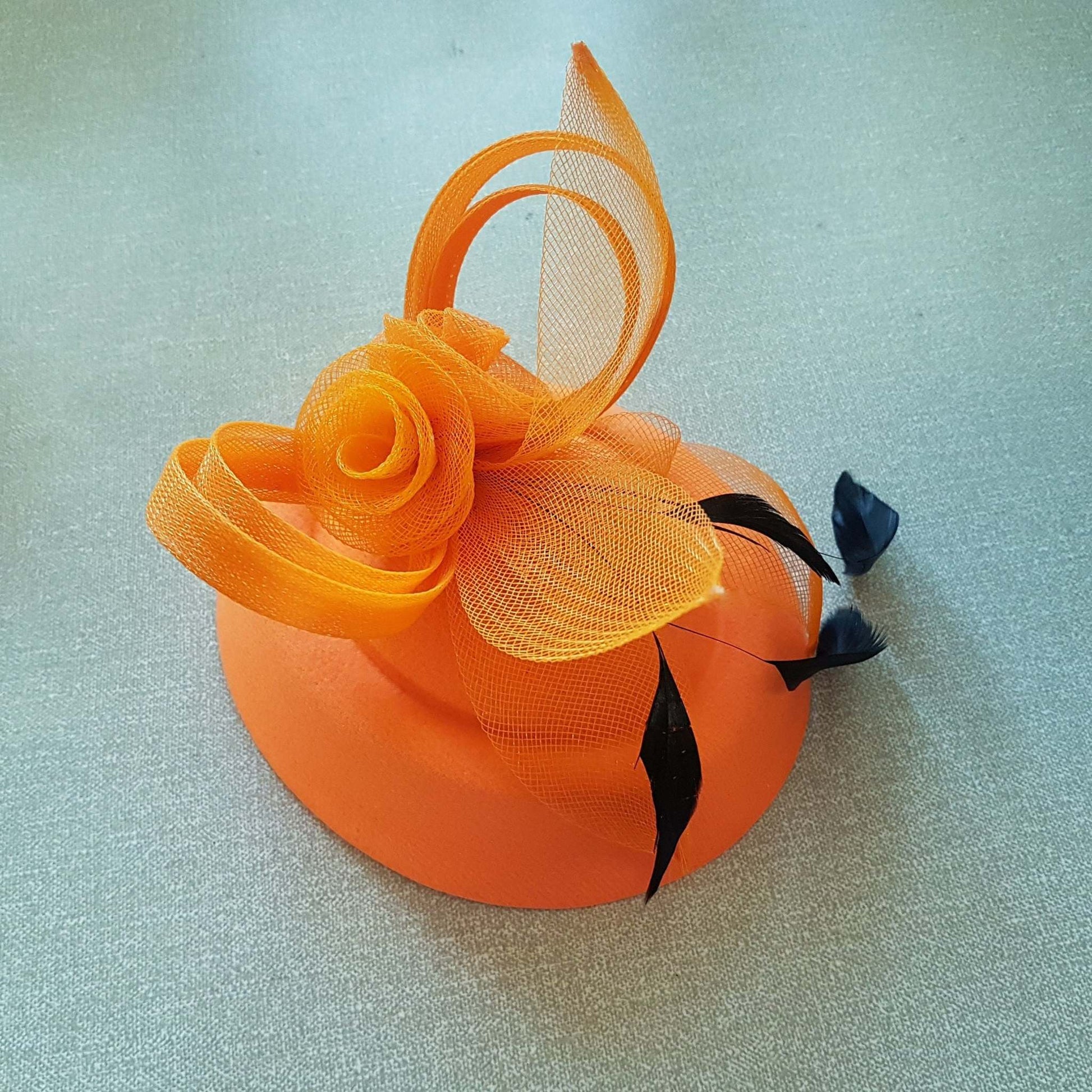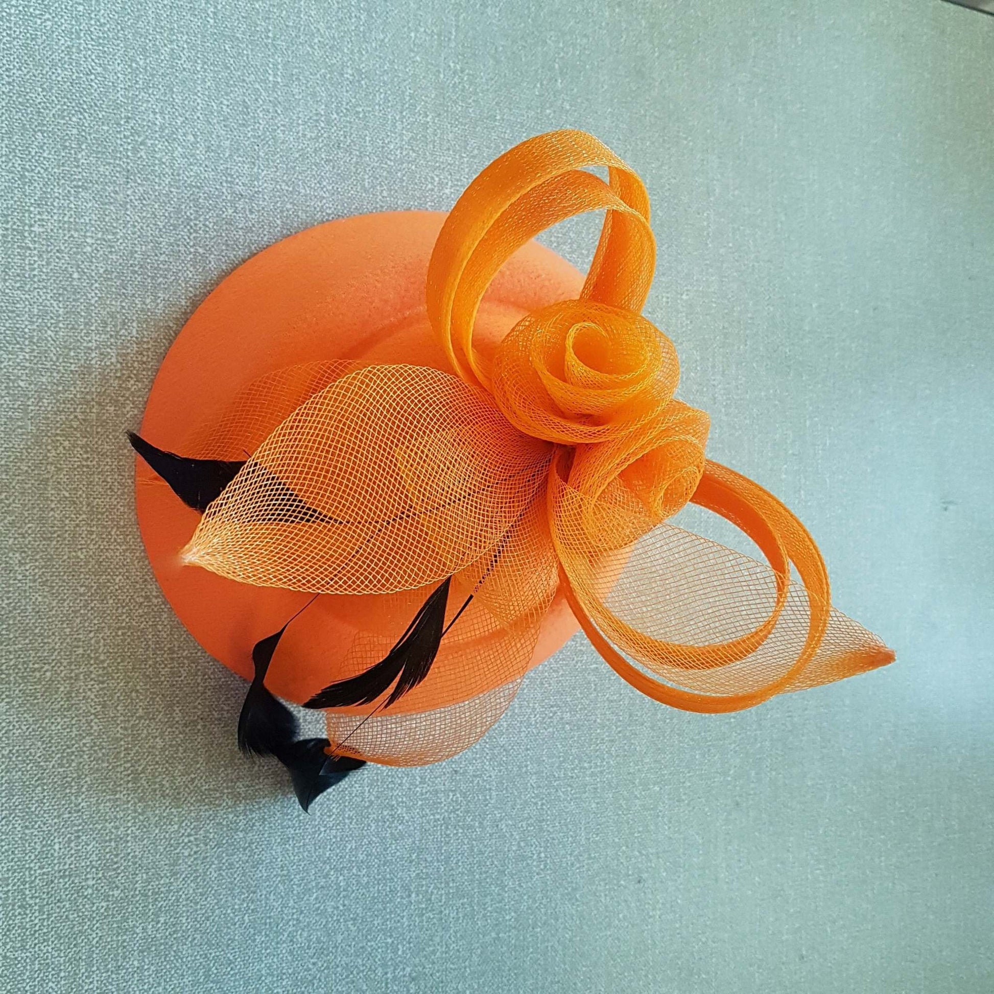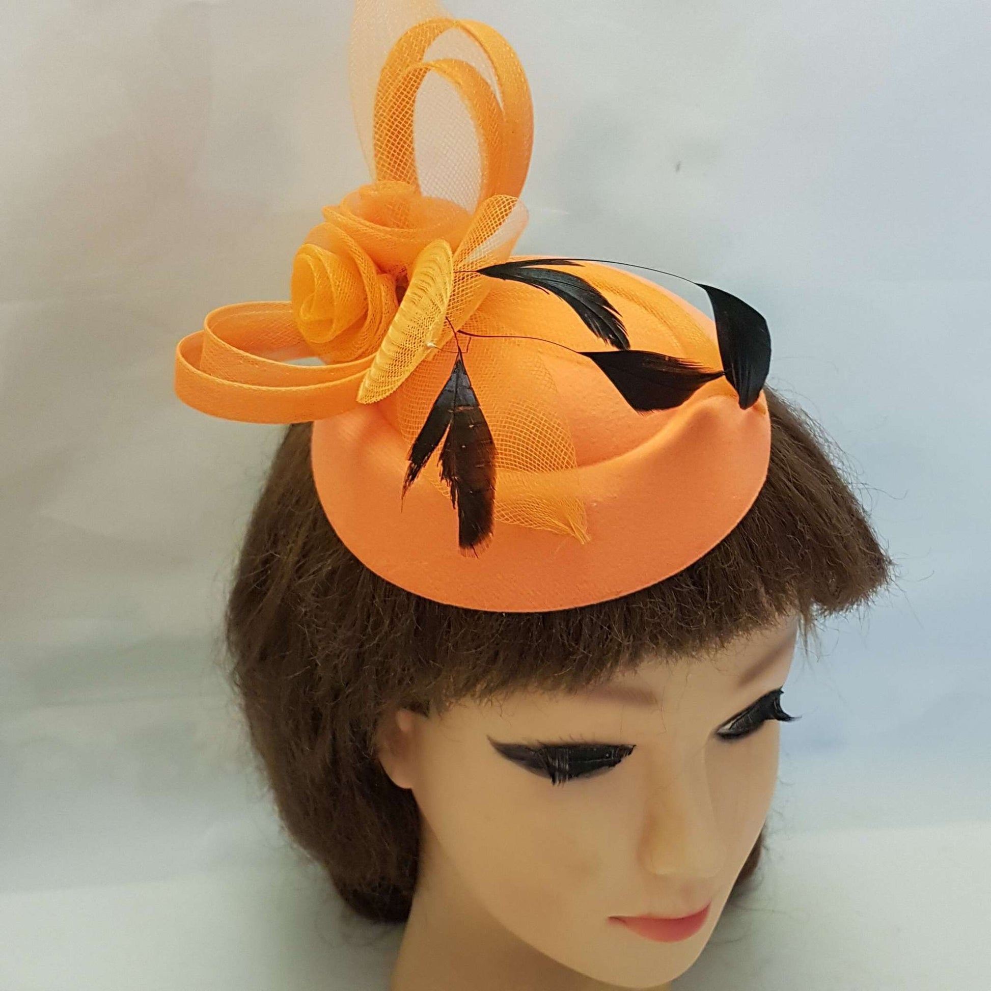 Fascinator, Hat fascinator Cocktail, Wedding, Ascot fascinator,Vintage inspired hat fascinator. Wedding, Goodwood revival, Christening, Ascot, Prom , Special occasion hat Party etc..., Gorgeous Orange Hat fascinator. ORANGE Hat Fascinator with flower, crinoline loops and Black Feathers (if you like to have White feathers please message) This Faux felt like hat base has been made by hand and very light to wear. with beautful feathered fascinator Attachment option: Headband or Aligator clips with teeth Hat size - approx 6 inch around This can be worn from centre to a side part or middle part or accross the head or even with a birdcage veil options are endless with one of your own styles. Perfect for wedding , Race and ceremonies If you need that special little headpiece for your vintage event, the Races or a Wedding then this one could be for you! This can be worn from centre to a side part or middle part or even with a birdcage veil. options are endless with one of your own styles. Please Visit my shop for more Vintage birdcage veils ,fascinator hats and gatsby headbands etc...