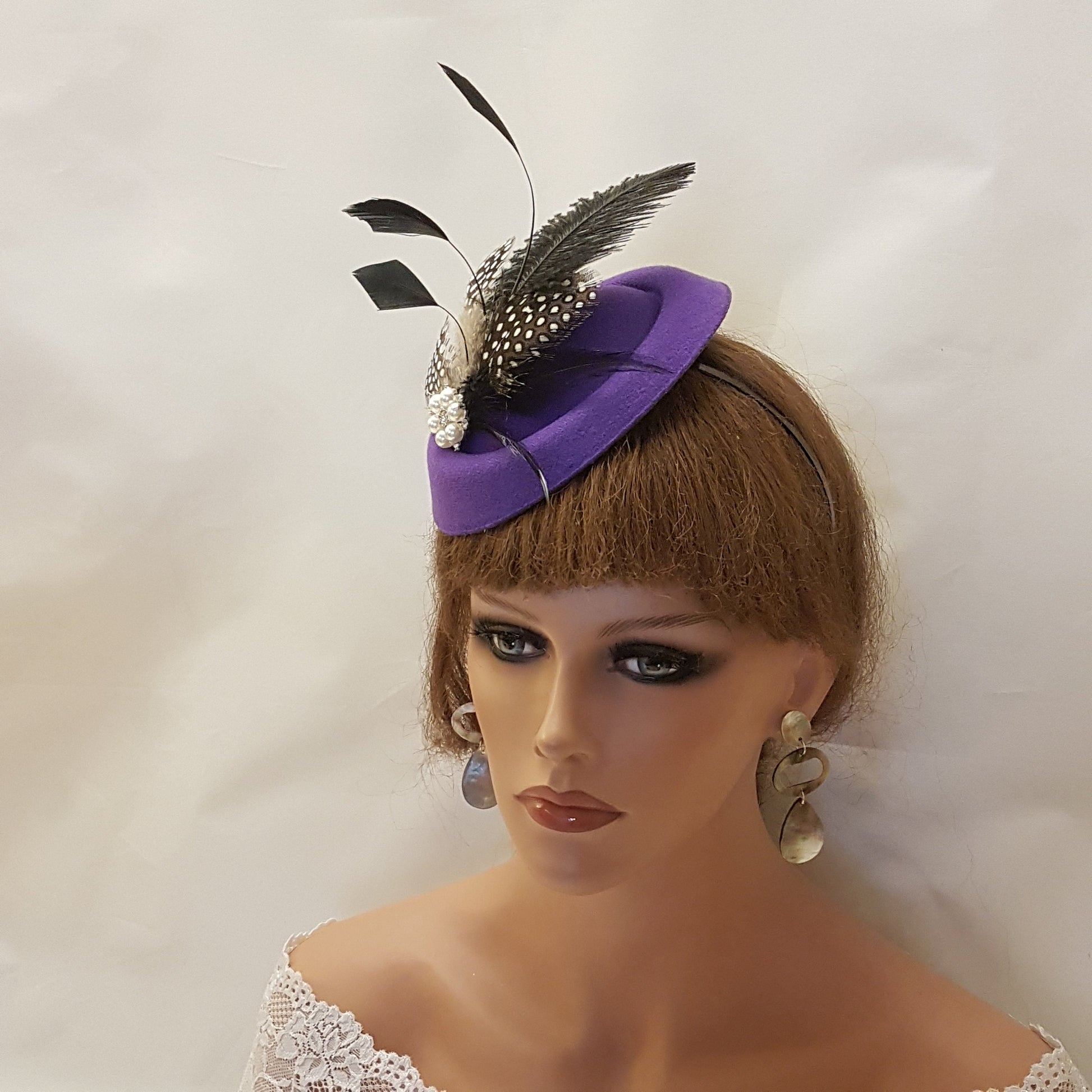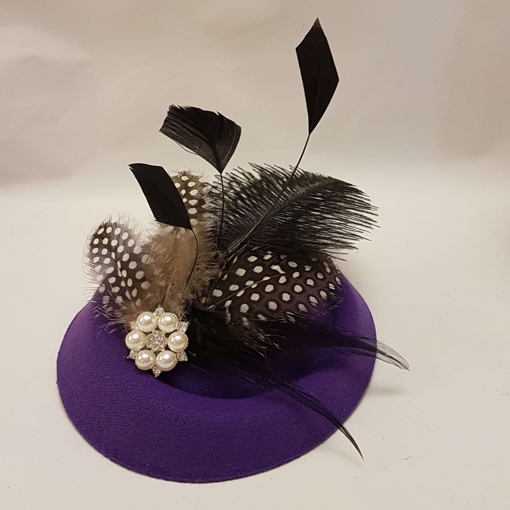 Fascinator, Purple Hat fascinator Cocktail, Wedding,Kentucy Derby, Ascot fascinator,Vintage inspired hat fascinator. Wedding, Goodwood revival, Christening, Ascot, Prom , Special occasion hat Party etc..., Gorgeous Hat fascinator. Purple Hat Fascinator with mix of Feathers This hat has been made by hand and very light to wear. with beautful feathers. Might have slight differences as these are made by hand. Hat Fascinator With assorted feathers of Ostritch ,and beautiful touch of Natural Guinea Fowl Spot Feathers and rooser feathers and a sparkling Pearl/ rhinestone jewel. Attachment option: Aligator clips with teeth Headband or Comb Hat size - approx 6 inch around This can be worn from centre to a side part or middle part or accross the head or even with a birdcage veil options are endless with one of your own styles. Perfect for wedding , Race and ceremonies This is available mostly other colours Pleae check our shop.