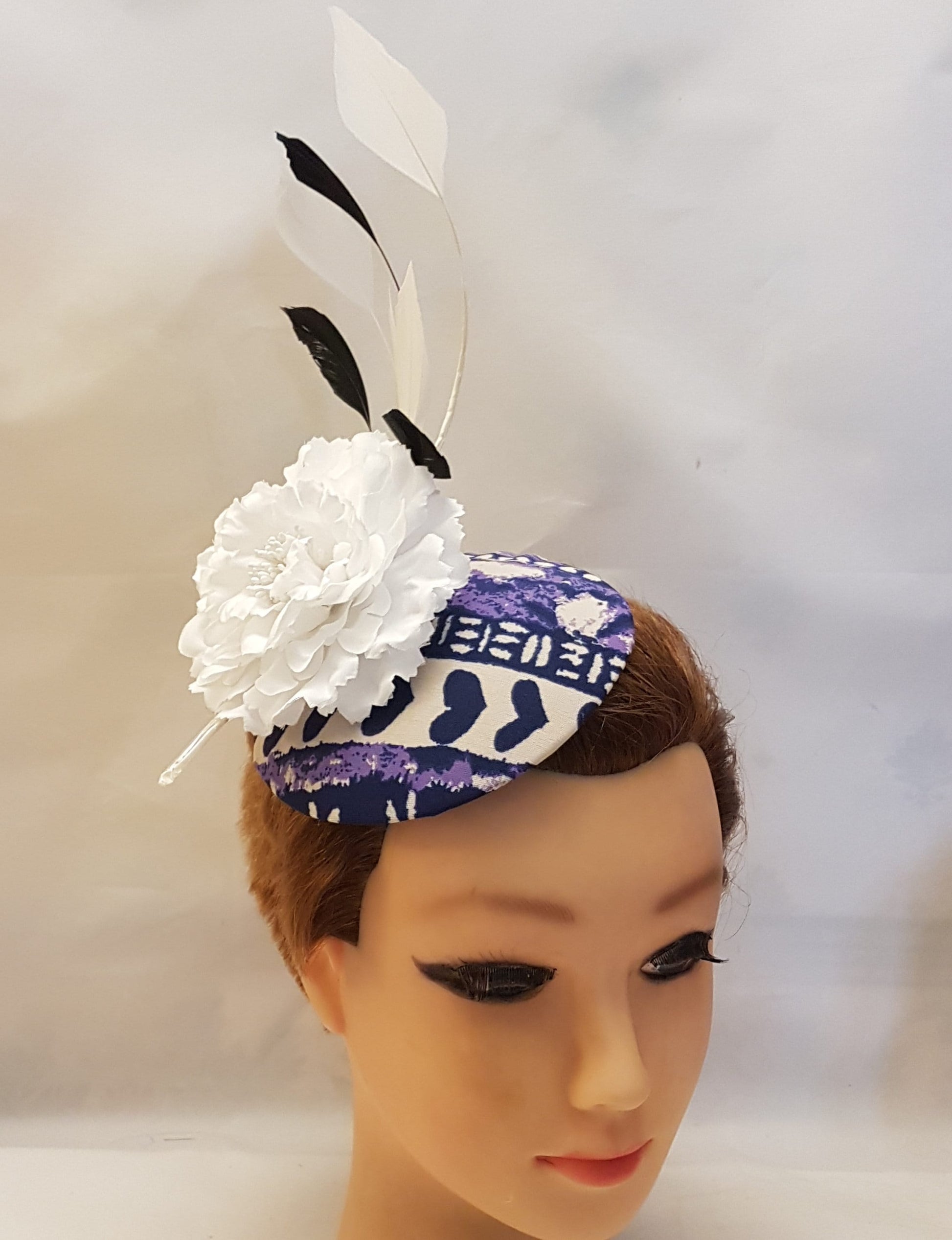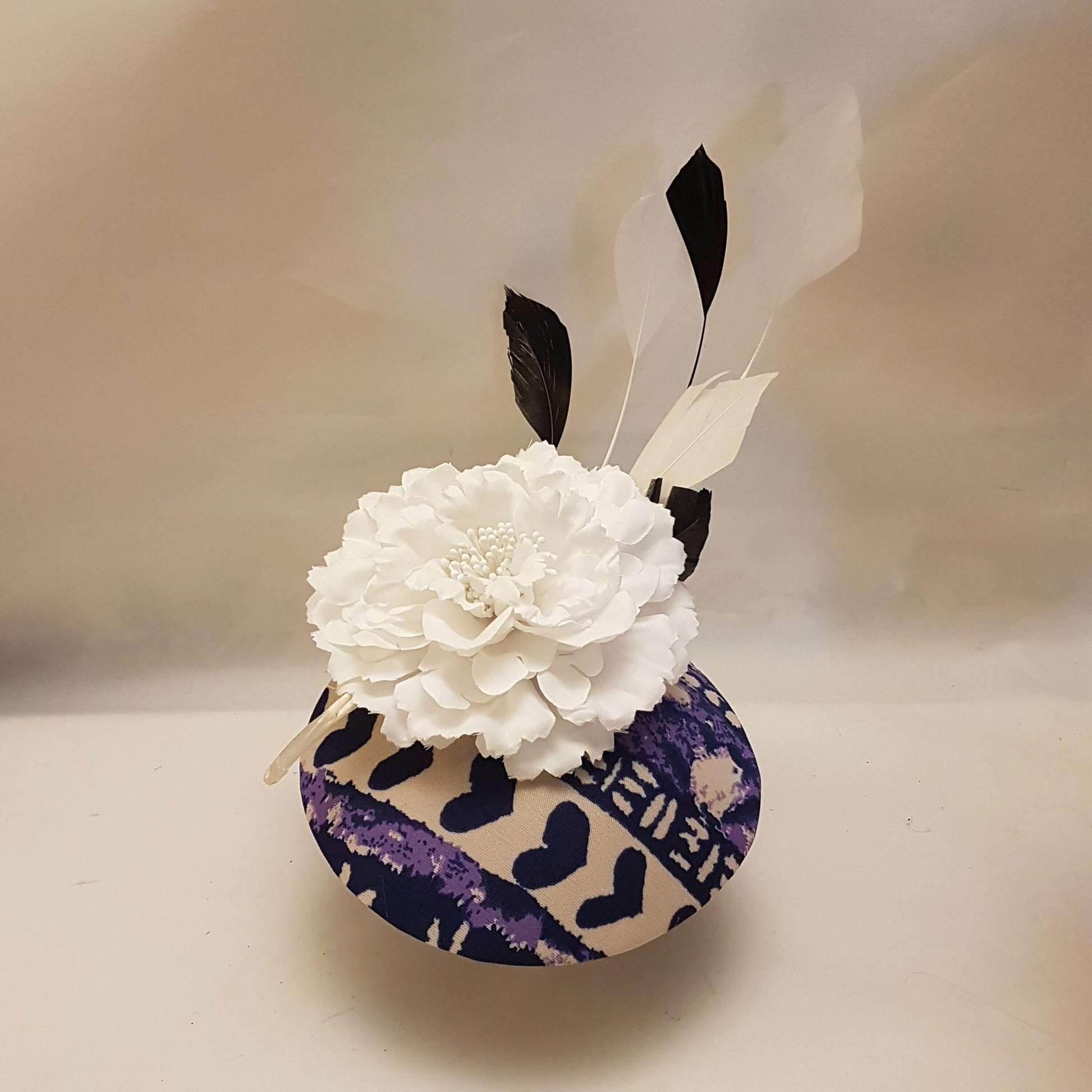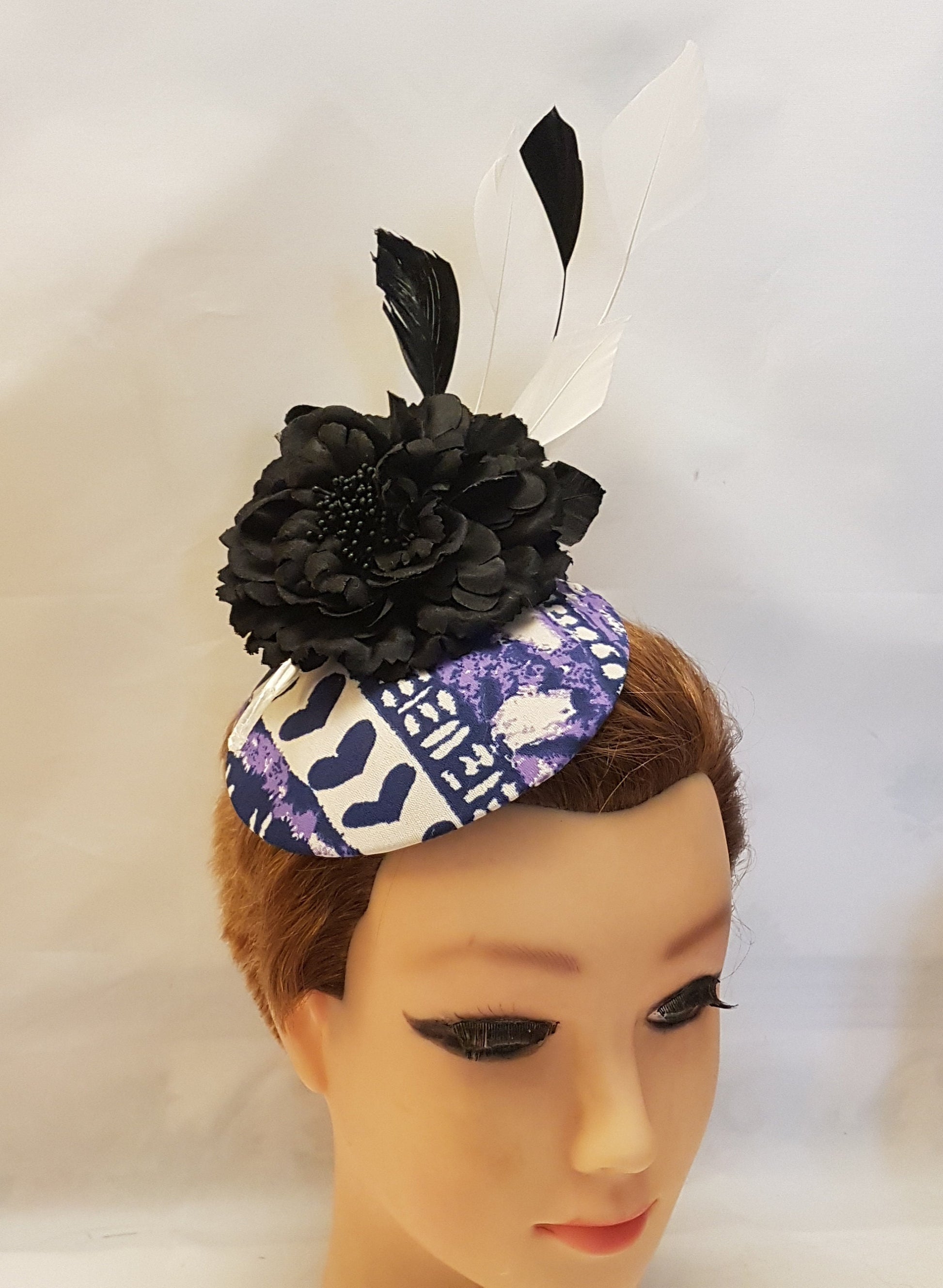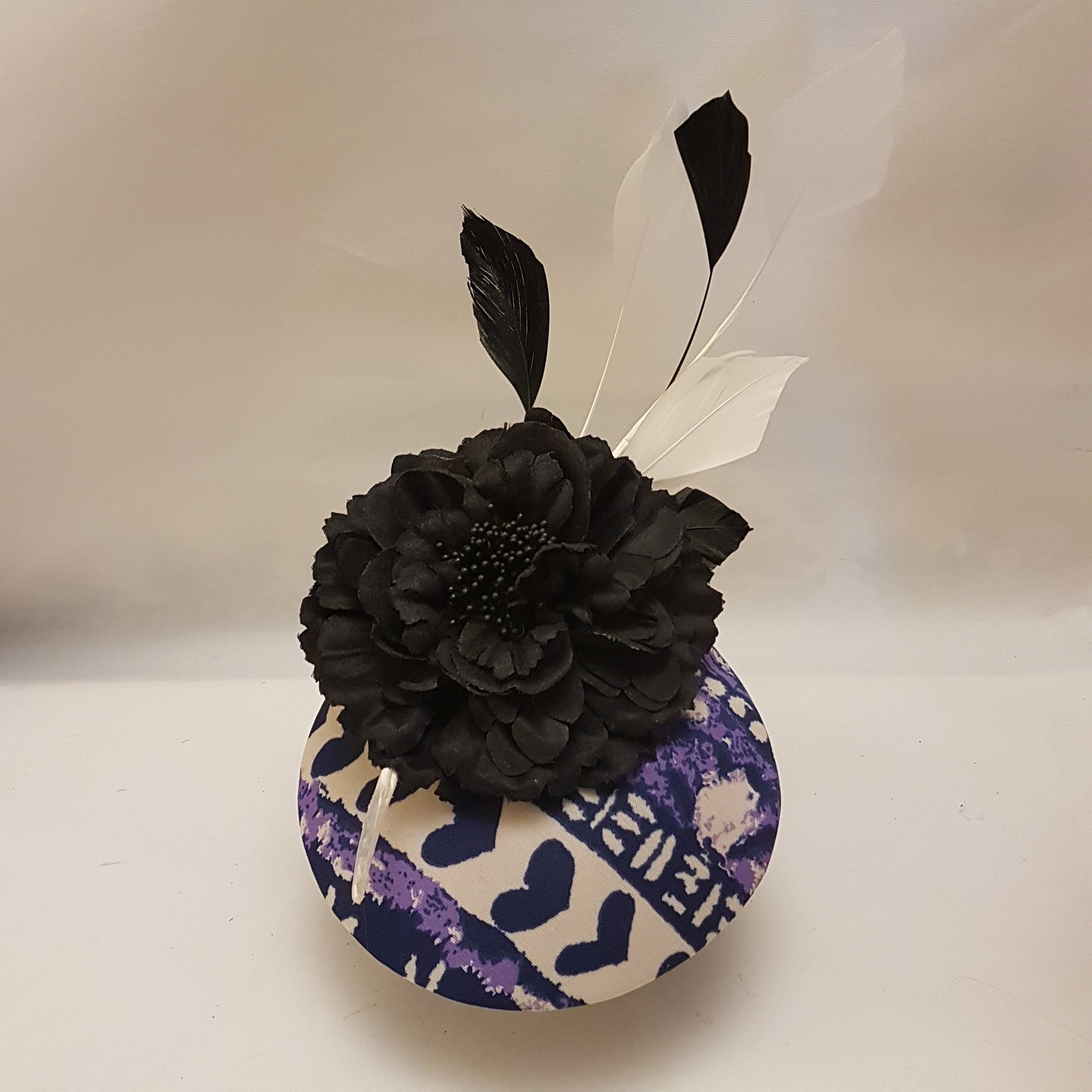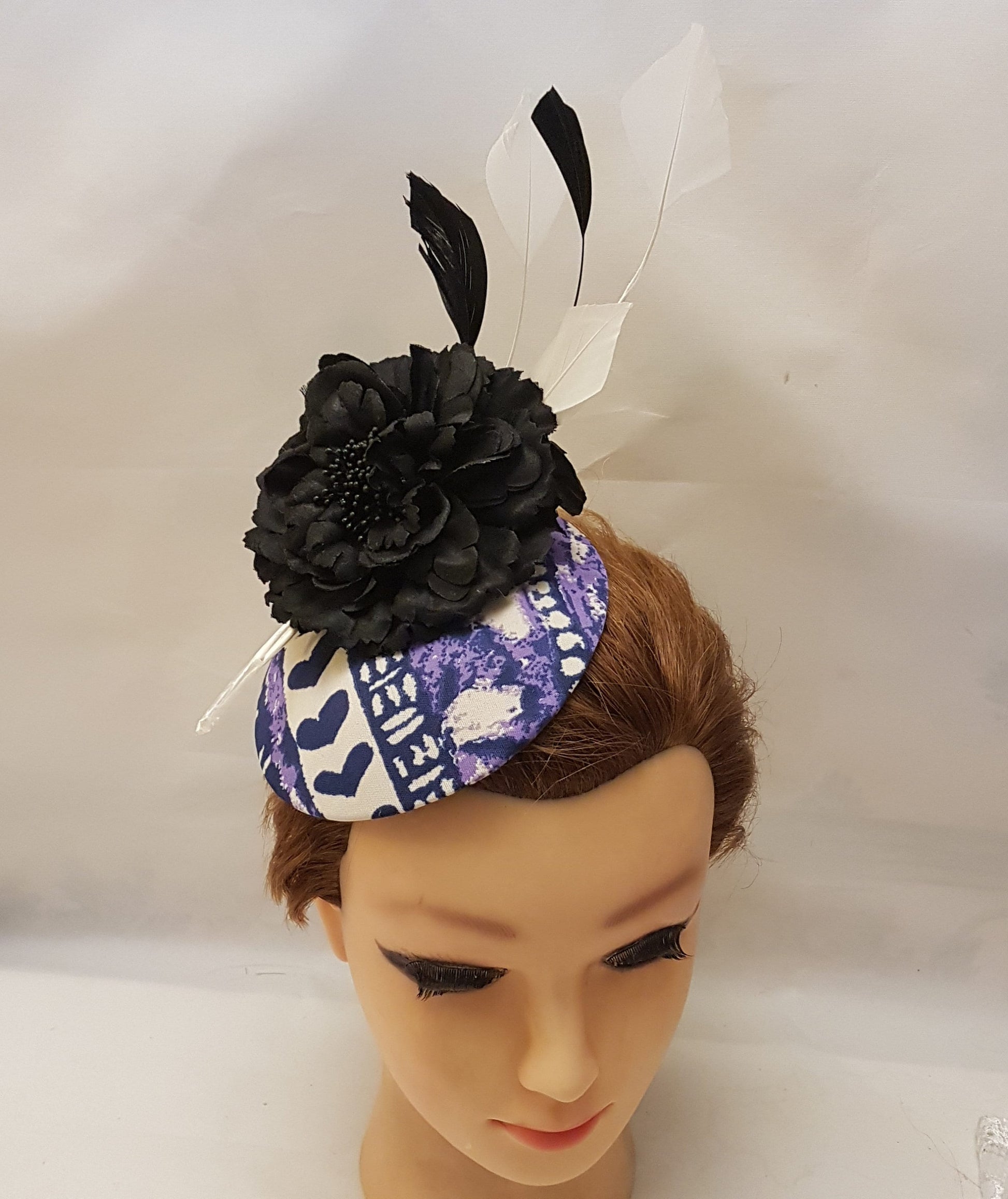Gorgeous Purple print Hat fascinator. Purple, Black and white print hat Fascinator with beautiful Goose feathers and a Black Or White Flower choose.