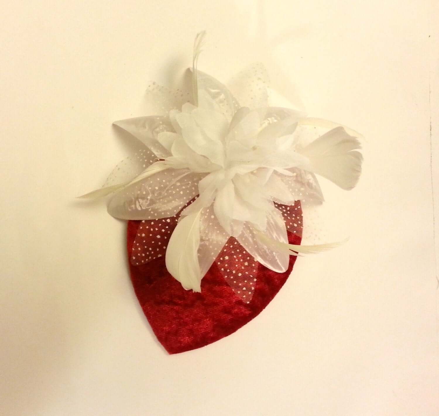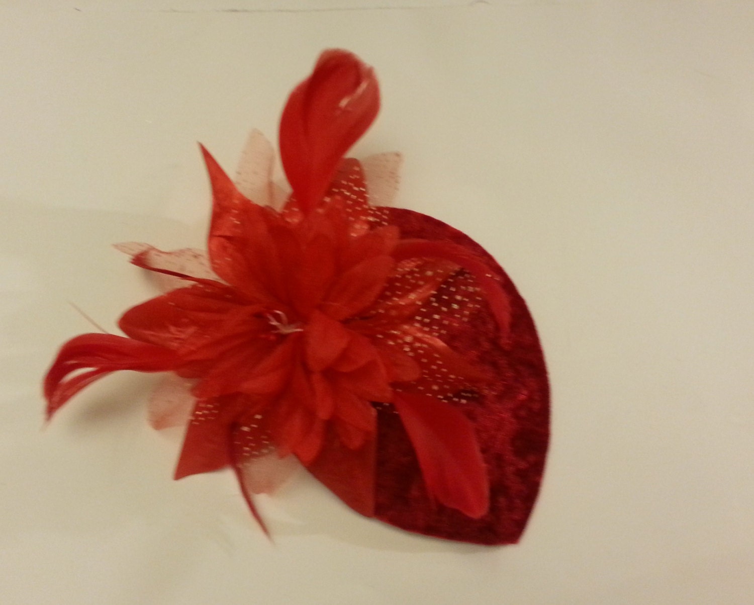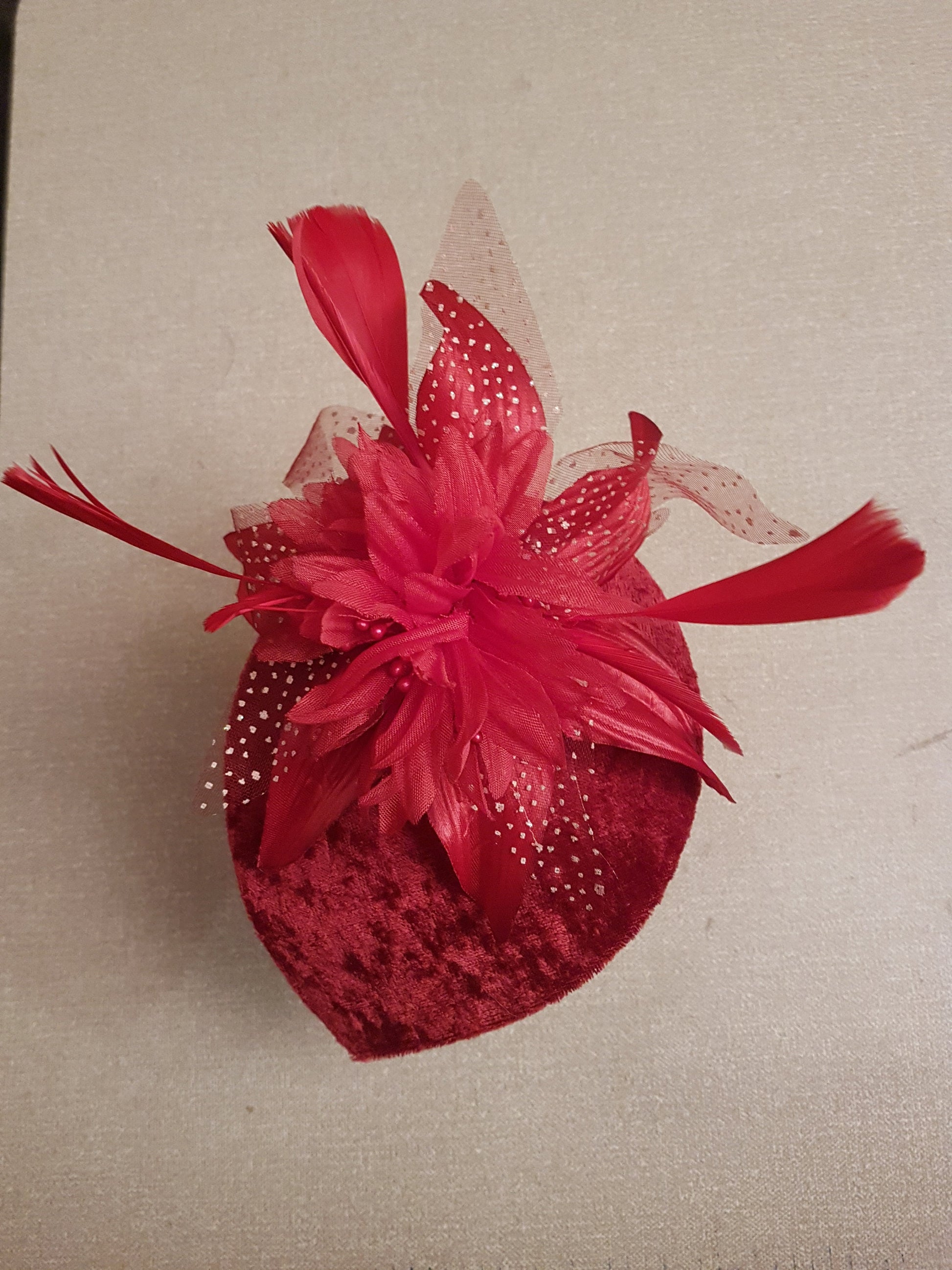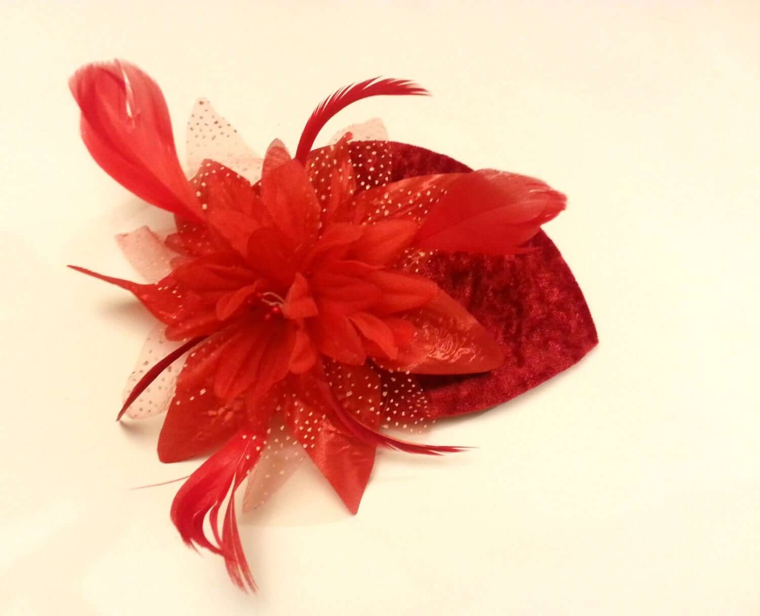 Hat fascinator Wedding, Ascot fascinator,Vintage inspired Tear drop hat fascinator. Wedding, Goodwood revival, Christening, Ascot, , ceremony, Prom Christmas Party etc..., Gorgeous Teardrop Hat fascinator. Red Velvetor Hat Fascinator with Red, white or Black Feather flower. This Velvet hat has been made by hand teardrop shape and very light to wear. It is covered in quality Red Velvet with beautiful feathered flower. If you need that special little headpiece for your vintage event, the Races or a Wedding then this one could be for you! This can be worn from centre to a side part or middle part or even with a birdcage veil. options are endless with one of your own styles. Please Visit my shop for more Vintage birdcage veils ,fascinator hats and gatsby headbands etc...