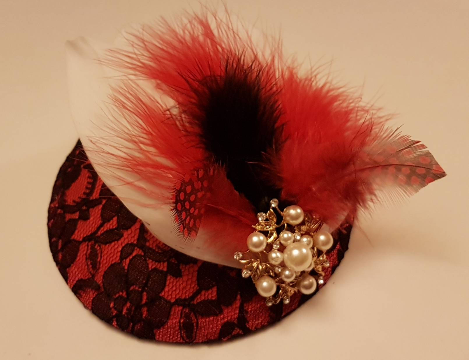 Feather Fascinator, Red and black hat fasvinator hat fascinator with assorted feathers of ostritch fringe ,beautiful touch of Pheasant and rooser feathers and a sparkling Pearl/ rhinestone jewel. Vintage Style. Made of sparkle rhinestones /Pearls Gold tone Jewel Options for attachment: Aligator clips or Black Headband. Please Check this link with black feathers