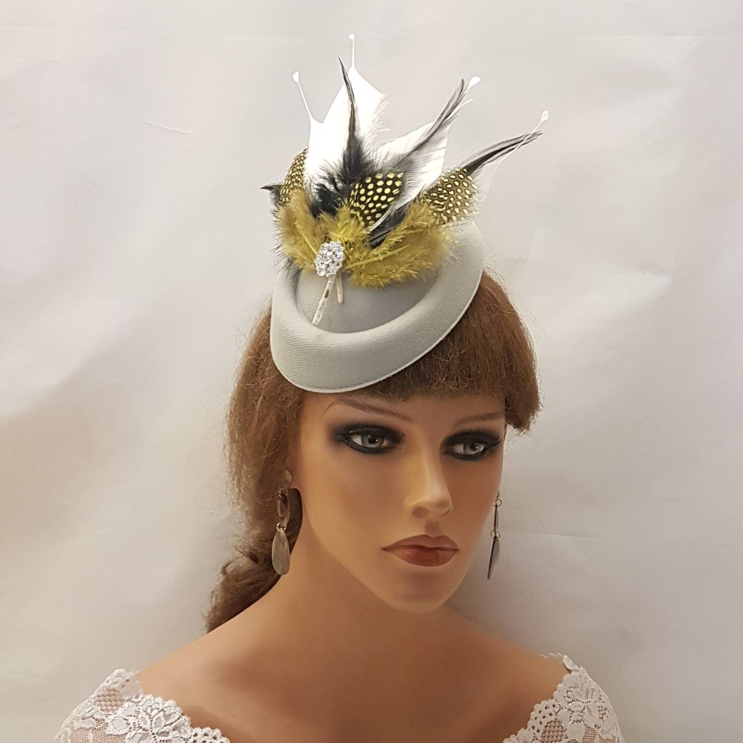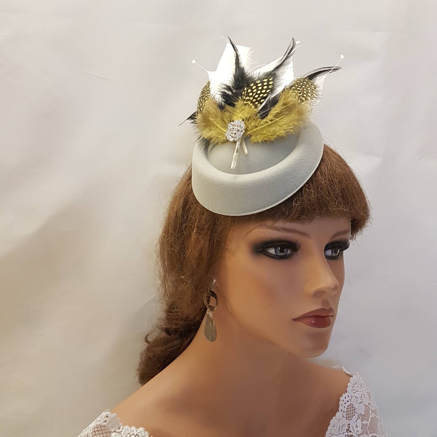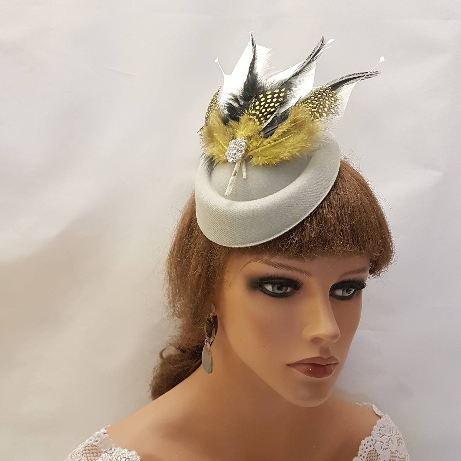 WHITE Fascinator Hat with Mustard Gold, black and white feathers. Adorned wirh sparkly crystal jewel. Cocktail, Ascot fascinator, Vintage inspired hat fascinator. Wedding, Goodwood revival, Christening, Ascot, Prom , Special occasion hat Party etc..., Gorgeous Hat fascinator. White Hat Fascinator with beautiful spotted Guinea fowl feathers,and Goose feathers and sparkly crystal jewel. This hat has been made by hand and very light to wear. Attachment option: Headband or Aligator clips with teeth Hat size - approx 17cm around Perfect for wedding , Race and ceremonies If you need that special little headpiece for your vintage event, the Races or a Wedding then this one could be for you! This can be worn from centre to a side part or middle part or even with a birdcage veil. options are endless with one of your own styles. Please Visit my shop for more Vintage birdcage veils ,fascinator hats and gatsby headbands etc...