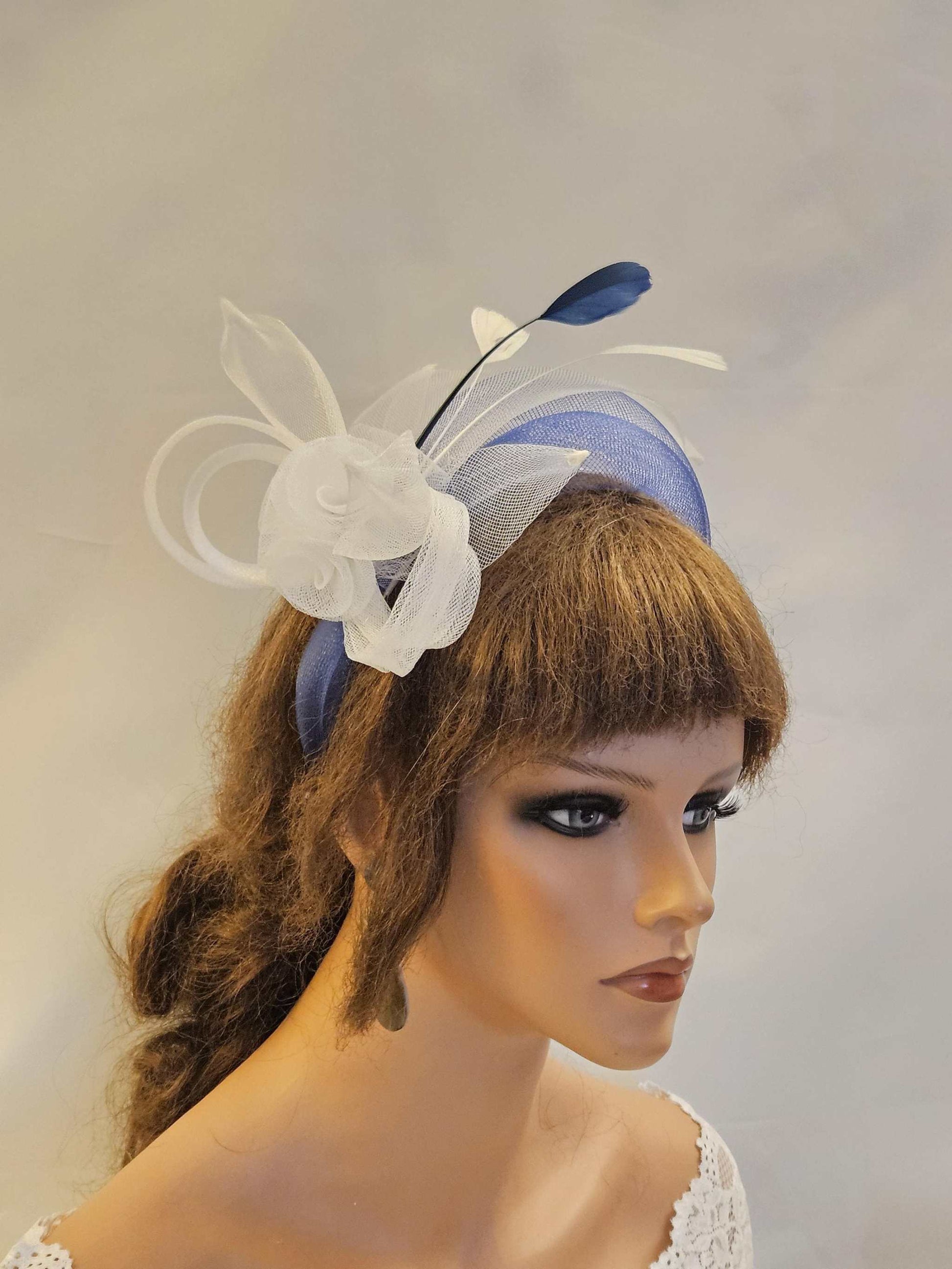 WHITE & BLUE Fascinator. Crinoline headband White & Navy Blue wedding headpiece with a Unique stunning Crinoline fascinator hair piece, with a Modern touch. This is a truly unique stunning piece and a new arrival * Please note the Primary colour of this headband is WHITE with Mini roses. Secondary colour is Navy. You can choose the secondary colour from the colour options. or you like to have this fascinator in just in Single colour please add a note at checkout. An amazing eye turner headpiece with feathers & Crinoline mini Roses Leaves and loops. The headpiece has been mounted on a Headband It is perfect for wedding guest, Mother of the bride, Races and any special occasion This Adorable statement headpiece is shaped that curves accross the head. Acented with Crinoline Roses, Leaves, loops and Feathers. One of the longest Leaf is beautifully floating over the Headband which goes acroos the head nicely. Please visit my shop for Veils ,birdcage veils,fascinators.